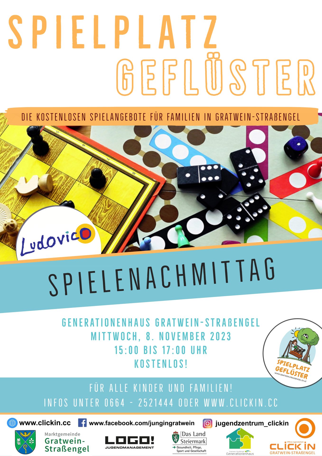 Gleich sechsmal im Jahr 2023 ist die OJA ClickIn in Kooperation mit der Gemeinde und den beiden Vereinen „FratzGraz“ und „Ludovico“ auch mit einem eigenen Spielangebot auf den Spielplätzen der Gemeinde und im Generationenhaus unterwegs. Diese Angebote finden das ganze Jahr über alle 2 Monate dienstags oder mittwochs statt und können von Kindern, Jugendlichen, Familien und natürlich auch Erwachsenen kostenlos und ganz unverbindlich besucht werden.